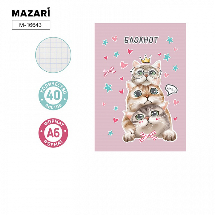Блокнот A6 MAZARI спираль 40 листов, клетка, Котики